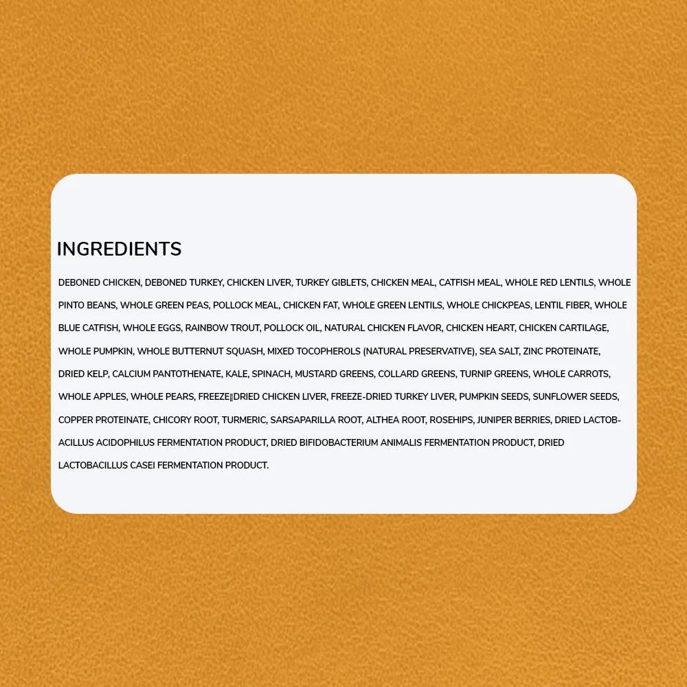 Fresh chicken meat (16%), chicken meal (15%), turkey meal (14%), red lentils, whole green peas, fresh chicken giblets (liver, heart, kidney) (6%), herring meal (4%), fresh whole eggs (4%), fresh whole flounder (4%), herring oil (3%), sun-cured alfalfa (2%), field beans (2%), green lentils, whole yellow peas, pea fibre, chicken fat (2%), fresh chicken cartilage (2%), dried brown kelp, fresh whole pumpkin, fresh whole butternut squash, fresh whole parsnips, fresh kale, fresh spinach, fresh mustard greens, fresh turnip greens, fresh whole carrots, fresh red delicious apples, fresh Bartlett pears, freeze-dried chicken liver, freeze-dried turkey liver, fresh whole cranberries, fresh whole blueberries, chicory root, turmeric, milk thistle, burdock root, lavender, marshmallow root, rose hips.SupplementsZinc chelate. Vitamin E (preservative)